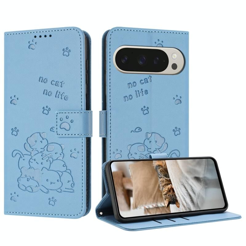 Θήκη δερμάτινη για Google Pixel 9 Pro XL με ανάγλυφο γατάκι και κορδόνι (Μωβ)