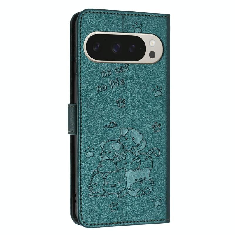 Θήκη δερμάτινη για Google Pixel 9 Pro XL με ανάγλυφο γατάκι και κορδόνι (Μωβ)