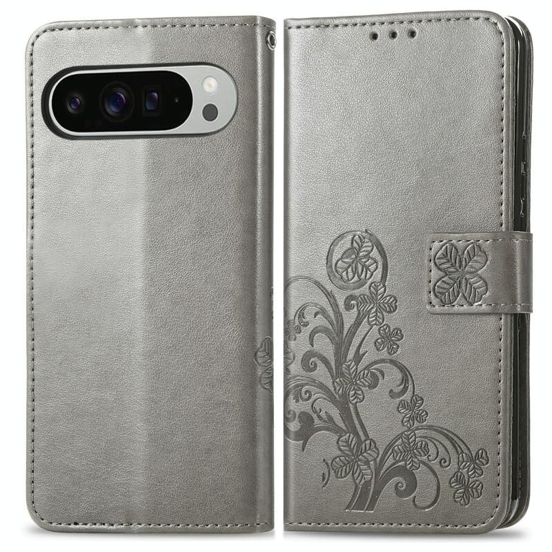 Για το Google Pixel 9 Pro XL τετράφυλλο κούμπωμα ανάγλυφη δερμάτινη θήκη τηλεφώνου (γκρι)