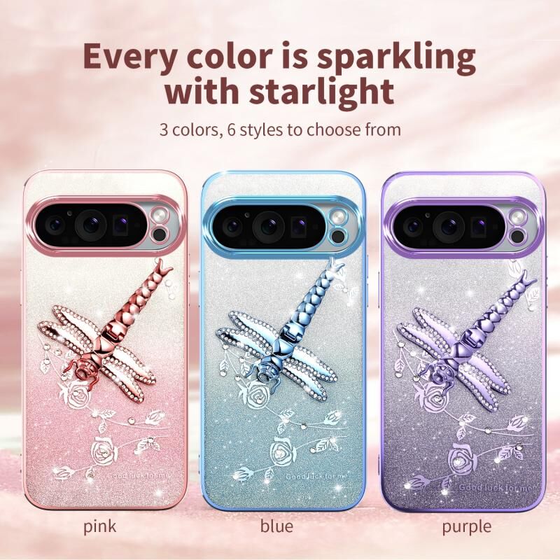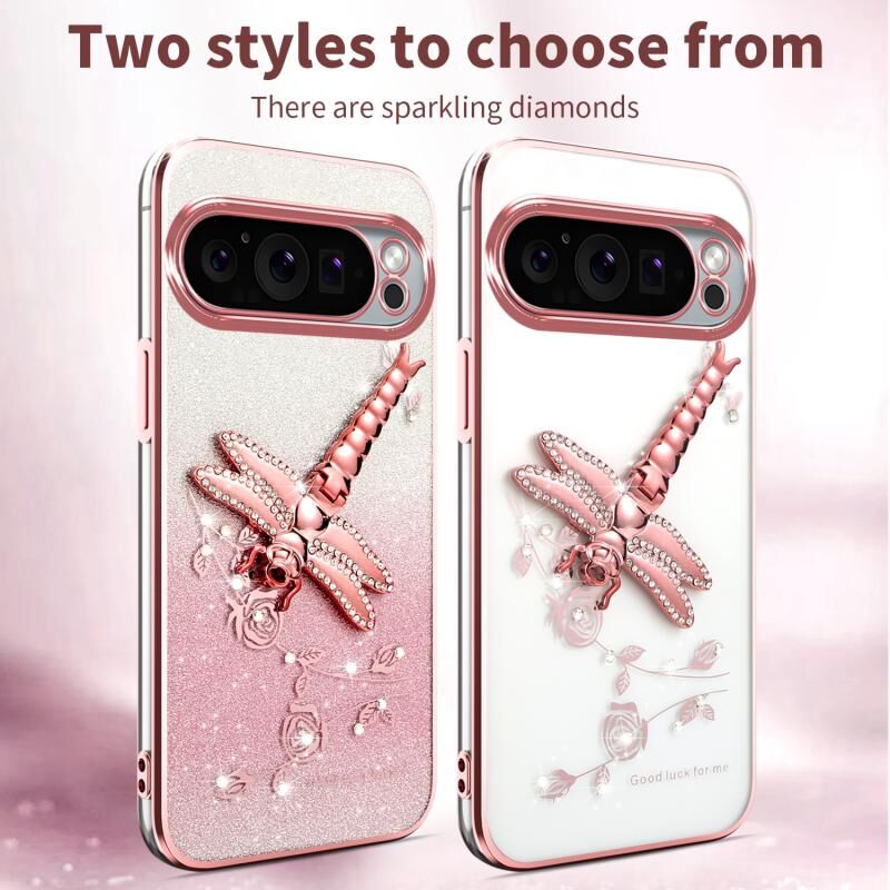 For Google Pixel 9 Pro XL Gradient Glitter Immortal 3D Dragonfly Holder Plated Phone Case(Blue)