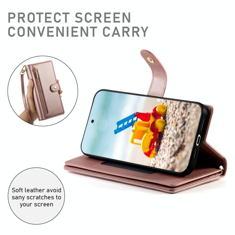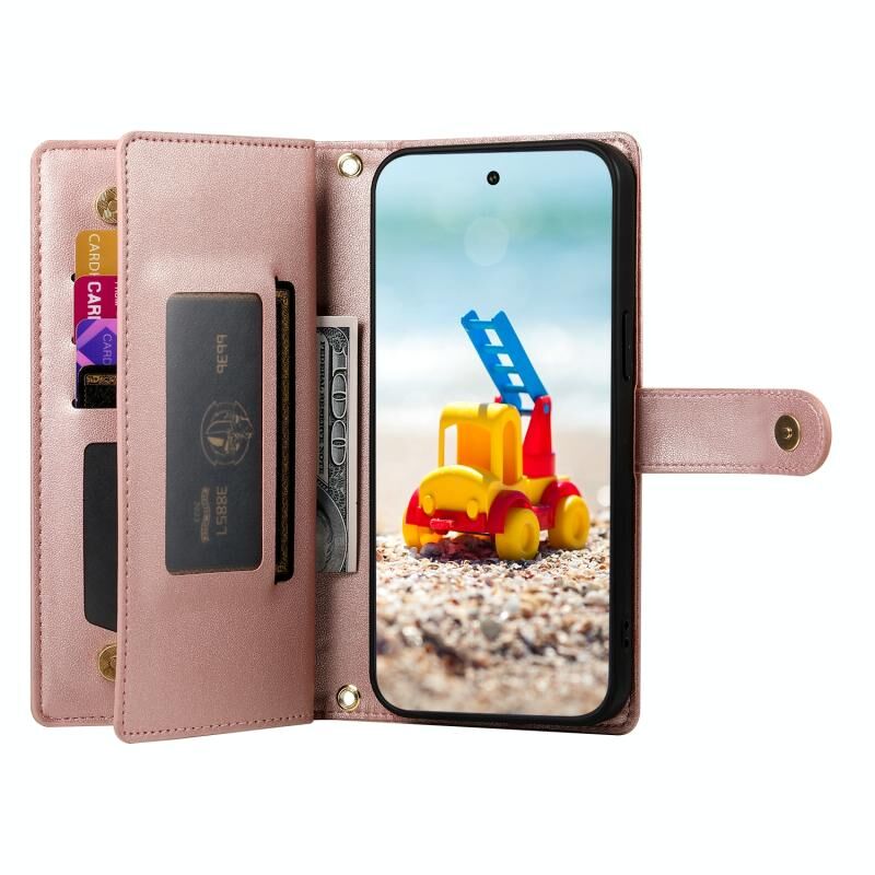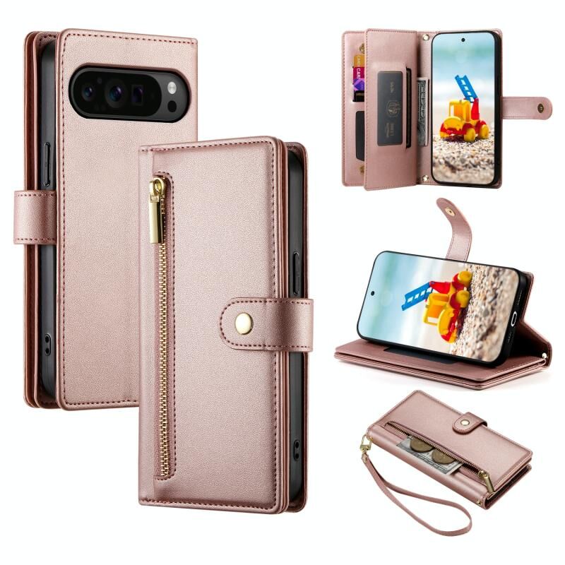 Για το Google Pixel 9 Pro XL Εννέα κάρτα-θυρίδα φερμουάρ πορτοφόλι τσάντα δερμάτινη θήκη τηλεφώνου (ροζ)