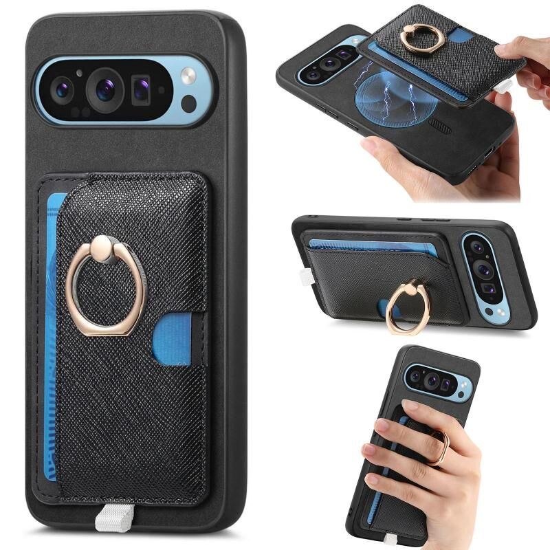 For Google Pixel 9 Pro XL Retro Cross Leather Ring Side Insert Card Bag MagSafe Phone Case(Black)