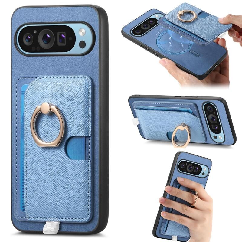 For Google Pixel 9 Pro XL Retro Cross Leather Ring Side Insert Card Bag MagSafe Phone Case(Blue)