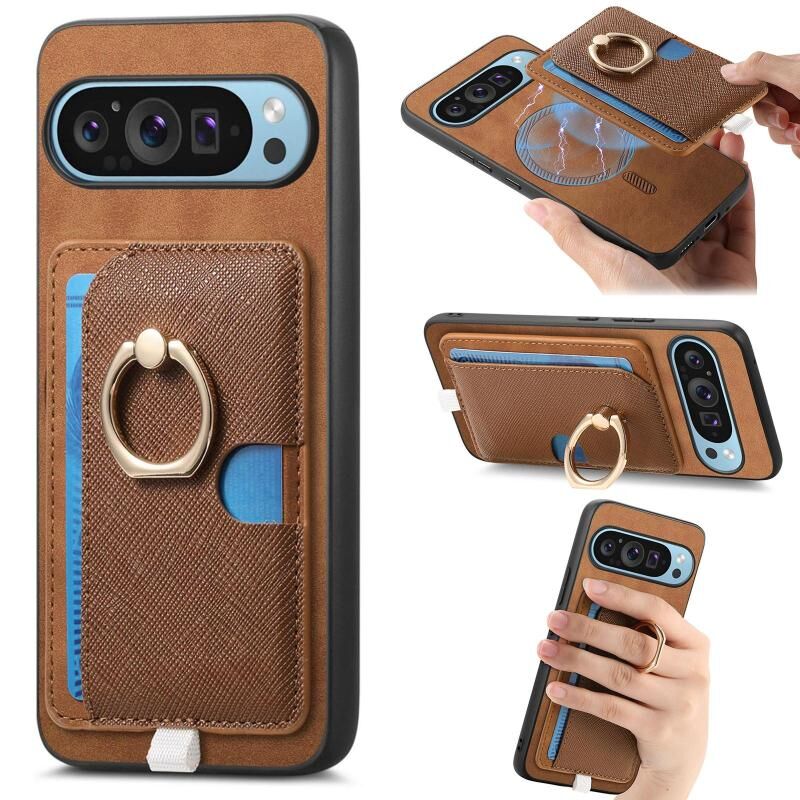 For Google Pixel 9 Pro XL Retro Cross Leather Ring Side Insert Card Bag MagSafe Phone Case(Brown)