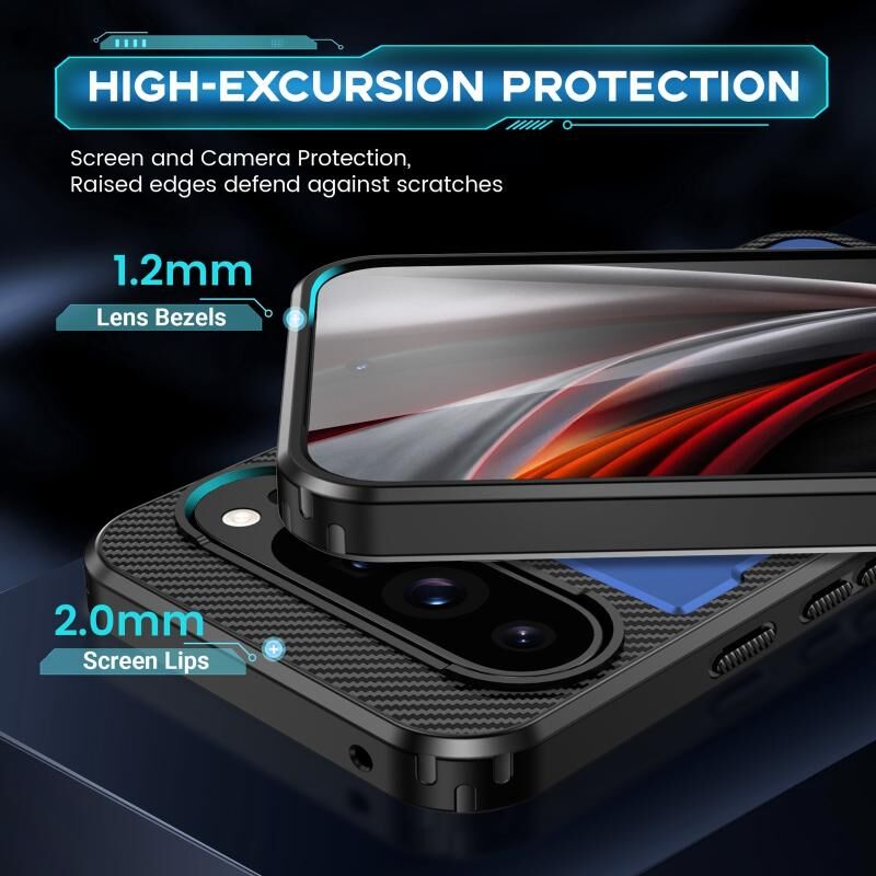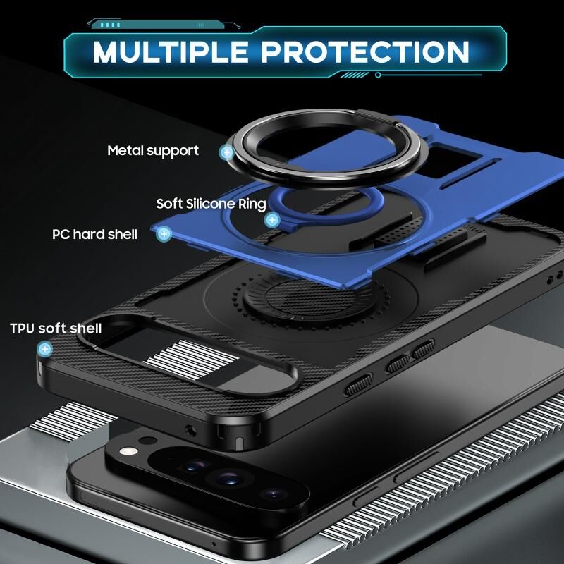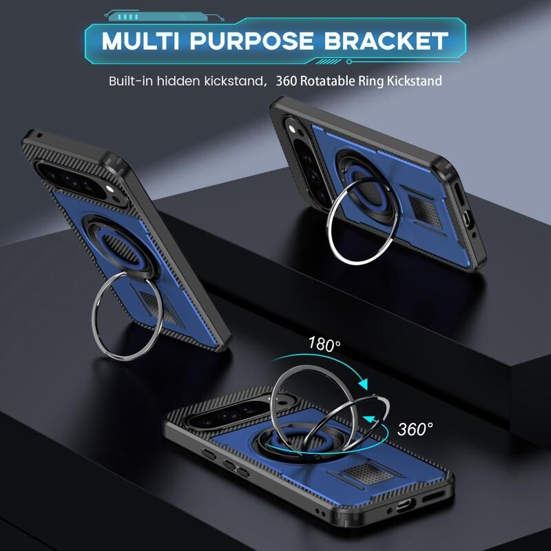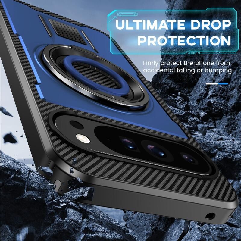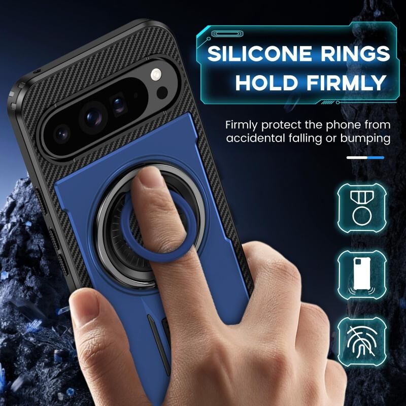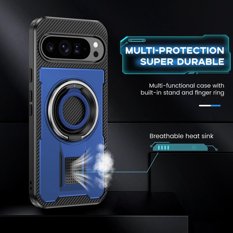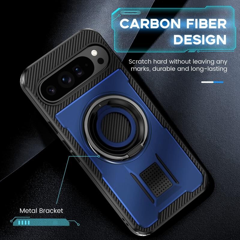 Για το Google Pixel 9 Pro XL Ring Holder Carbon Fiber PC Hybrid TPU τηλέφωνο υπόθεση (μπλε)