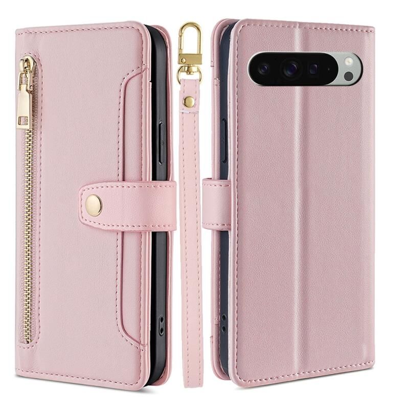 Για το Google Pixel 9 Pro XL Πρόβατο υφή Cross-body φερμουάρ πορτοφόλι δερμάτινη θήκη τηλεφώνου (ροζ)
