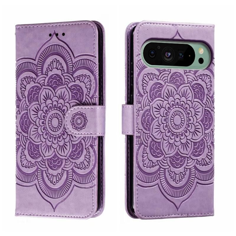 Για το Google Pixel 9 Sun Mandala ανάγλυφο μοτίβο τηλέφωνο δερμάτινη θήκη (μωβ)
