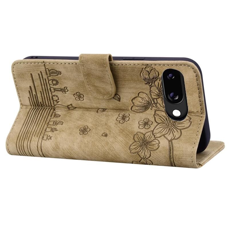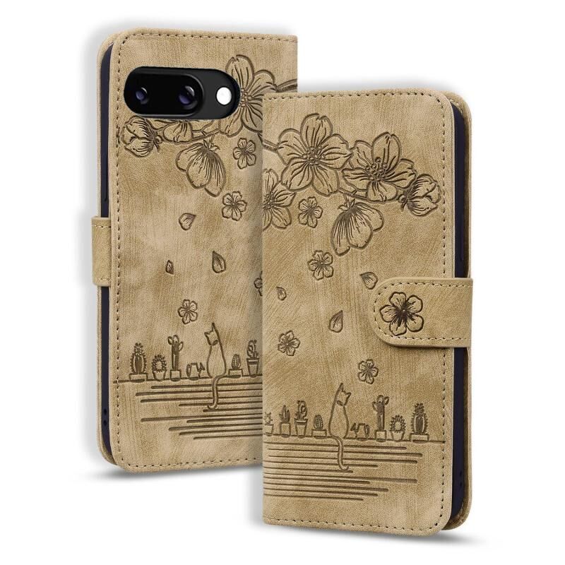 Θήκη τηλεφώνου από δέρμα με ανάγλυφο σχέδιο καρτούν Sakura Cat για Google Pixel 9a (Καφέ)