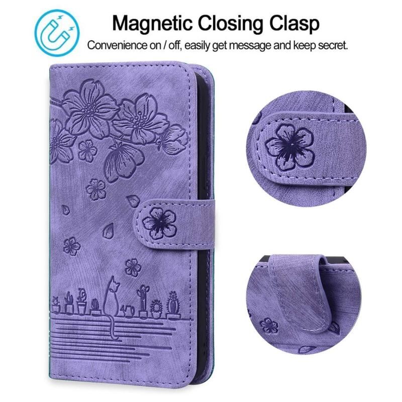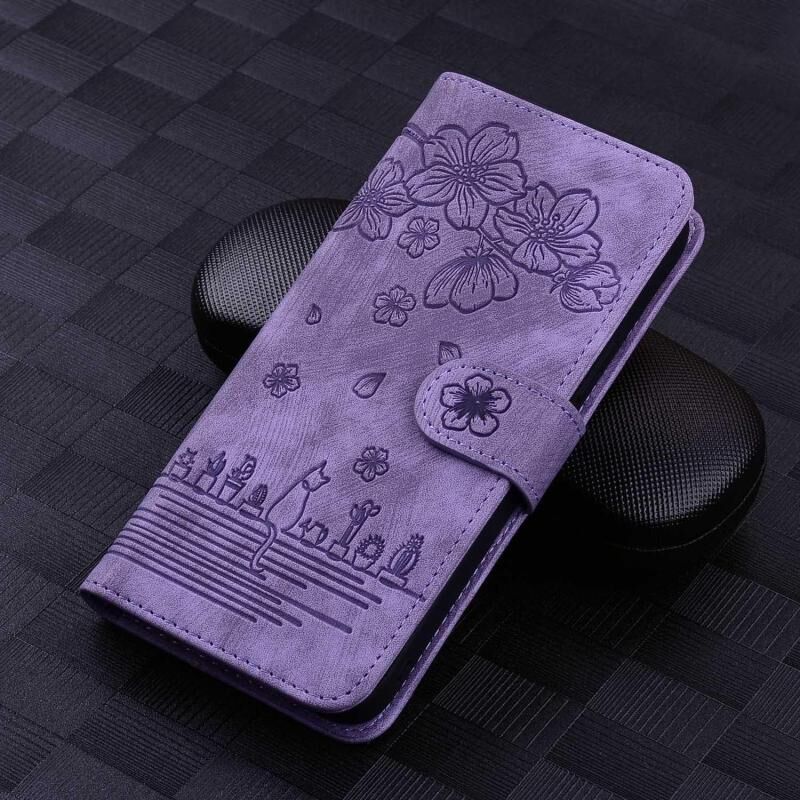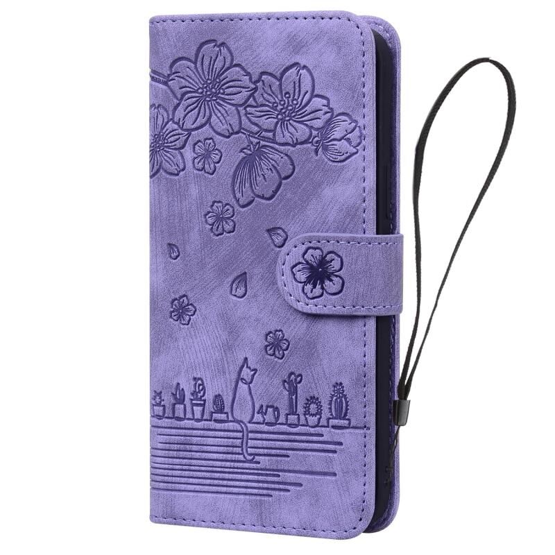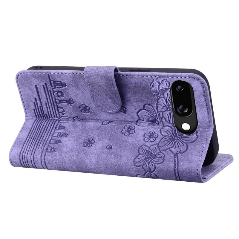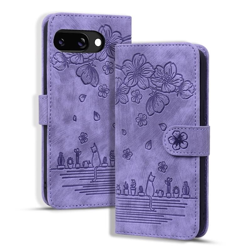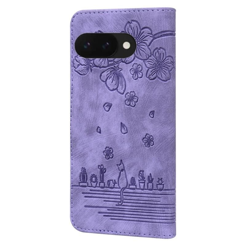 For Google Pixel 9a Cartoon Sakura Cat Embossed Leather Phone Case(Purple)