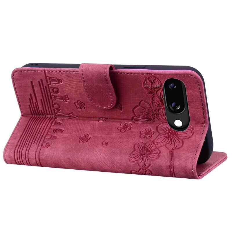 For Google Pixel 9a Cartoon Sakura Cat Embossed Leather Phone Case(Red)