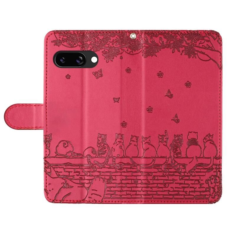 For Google Pixel 9a Cat Embossing Pattern Leather Phone Case with Lanyard(Red)