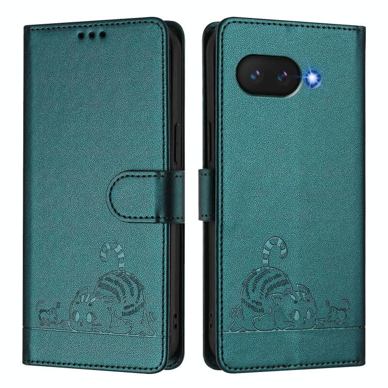 For Google Pixel 9a Cat Rat Embossed Pattern RFID Leather Phone Case with Lanyard(Peacock Green)