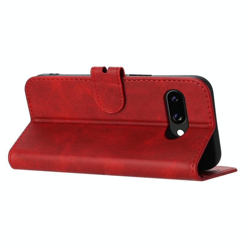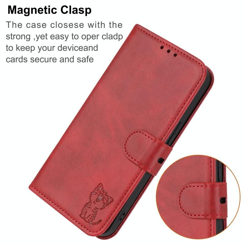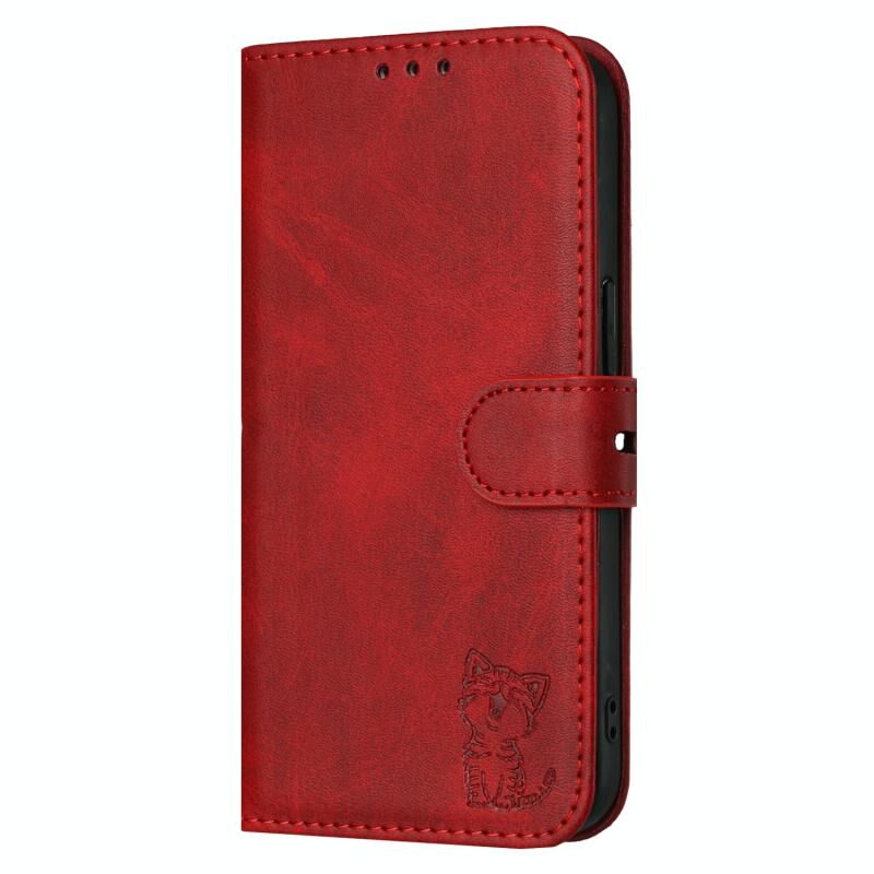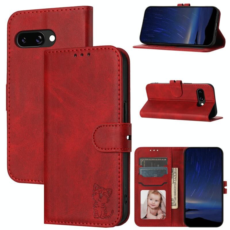 Θήκη τηλεφώνου από δέρμα με σχέδιο χαρούμενης γάτας σε ανάγλυφο για Google Pixel 9a (Κόκκινο)