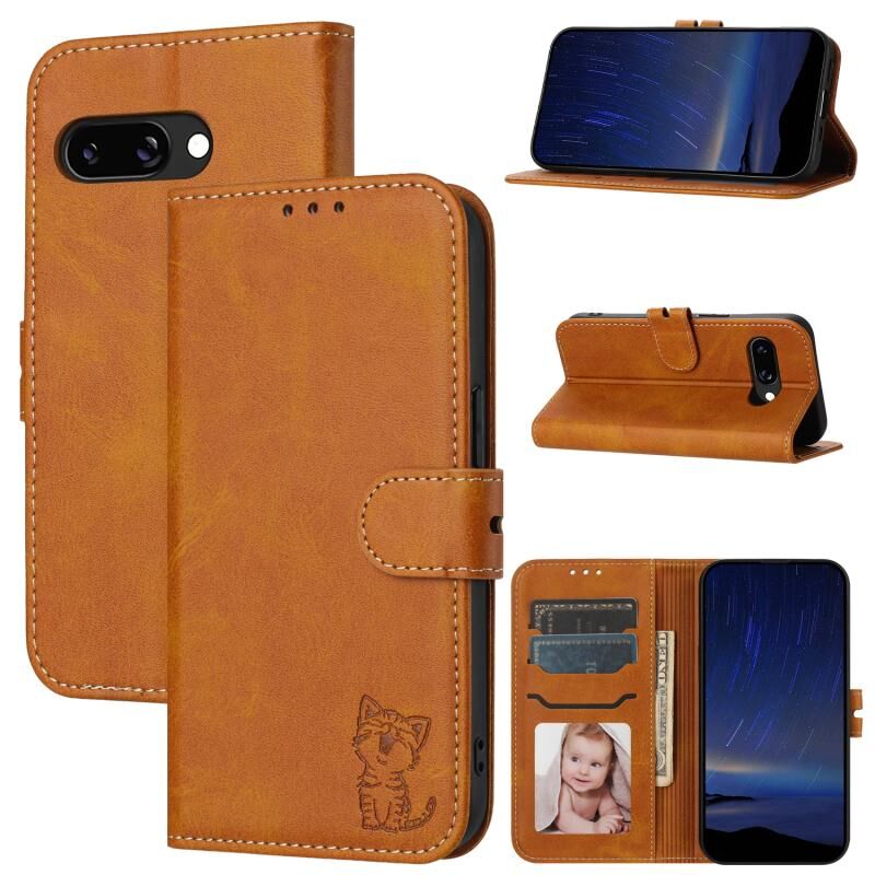 Θήκη τηλεφώνου από δέρμα με σχέδιο χαρούμενης γάτας σε ανάγλυφο για Google Pixel 9a (Κόκκινο)