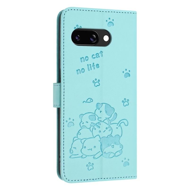 Θήκη δερμάτινη για Google Pixel 9a με ανάγλυφο γατάκι και κορδόνι (Μπλε)