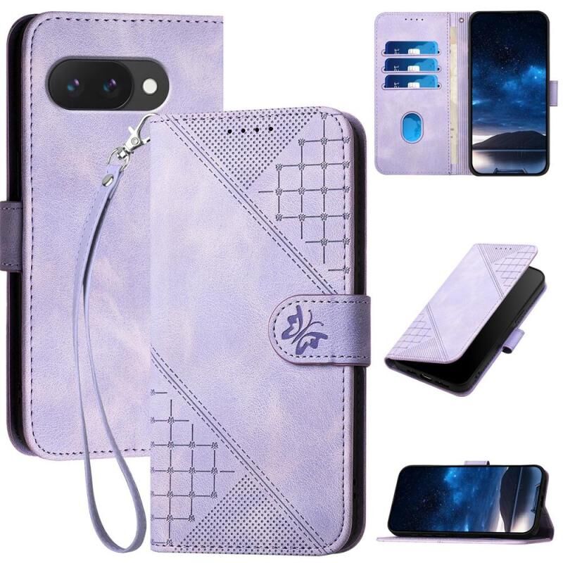 Θήκη τηλεφώνου δερμάτινη με ανάγλυφο σχέδιο πεταλούδας σε πλέγμα για Google Pixel 9a με κορδόνι (Σκούρο Μπλε)