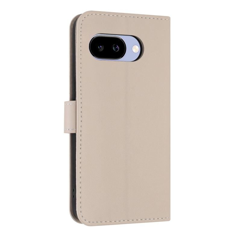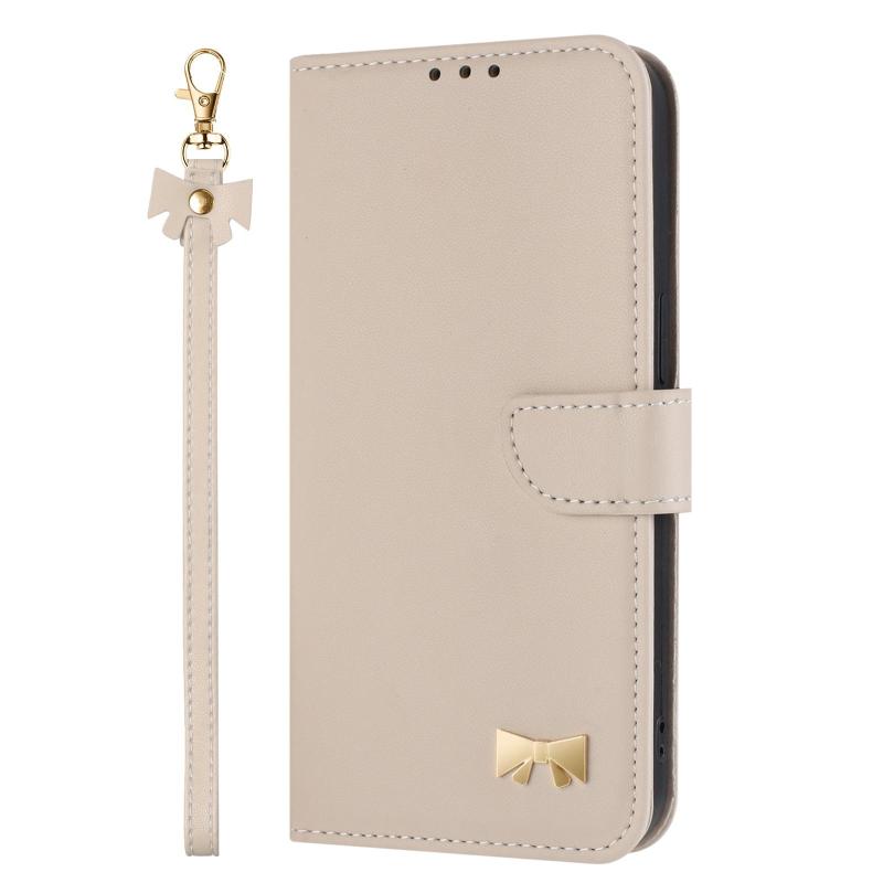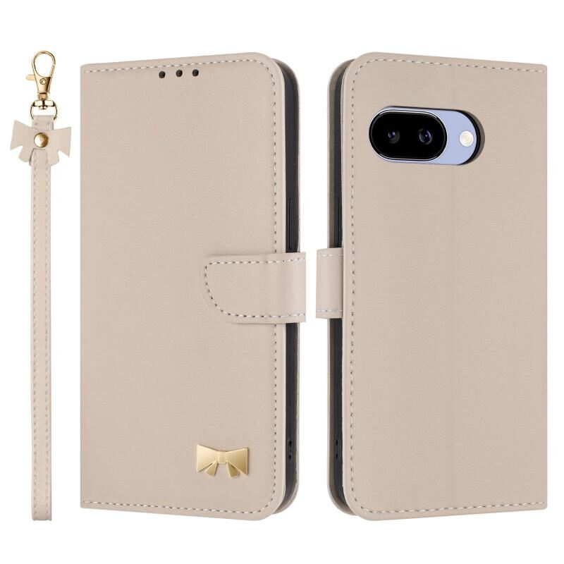 For Google Pixel 9a Metal Bow Leather Phone Case with Hand Strap(Apricot)