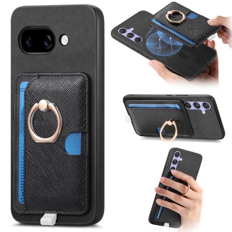 For Google Pixel 9a Retro Cross Leather Ring Side Insert Card Bag MagSafe Phone Case(Black)