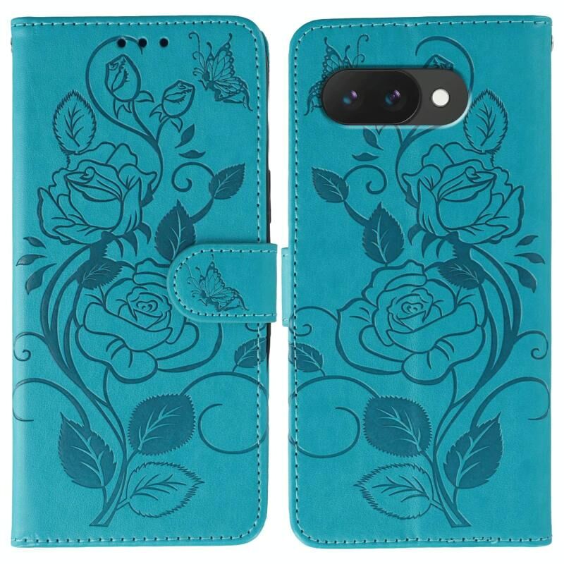 For Google Pixel 9a Rose Butterfly Embossed Leather Phone Case(Blue)