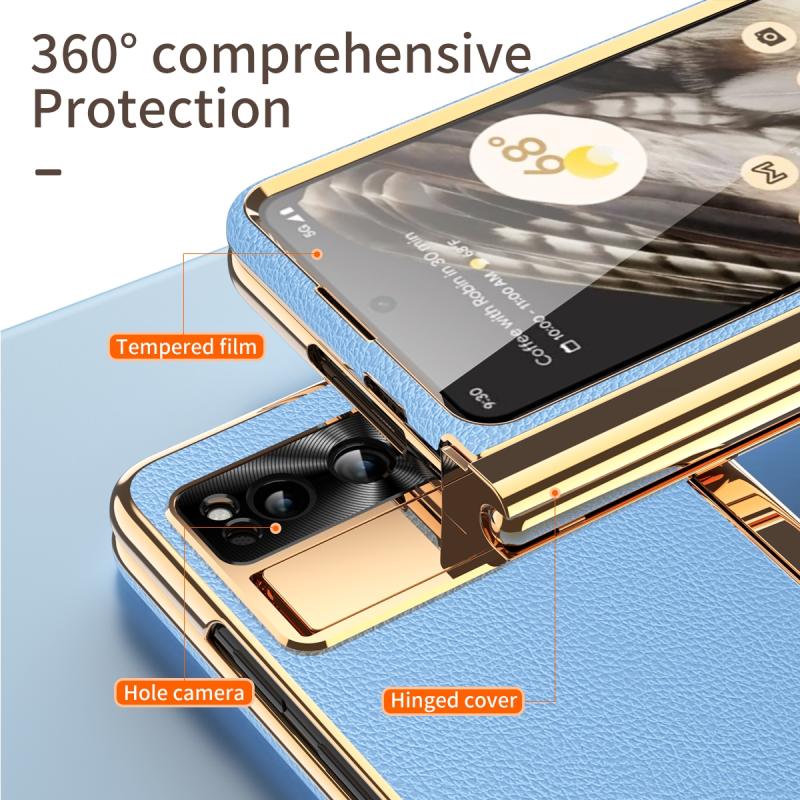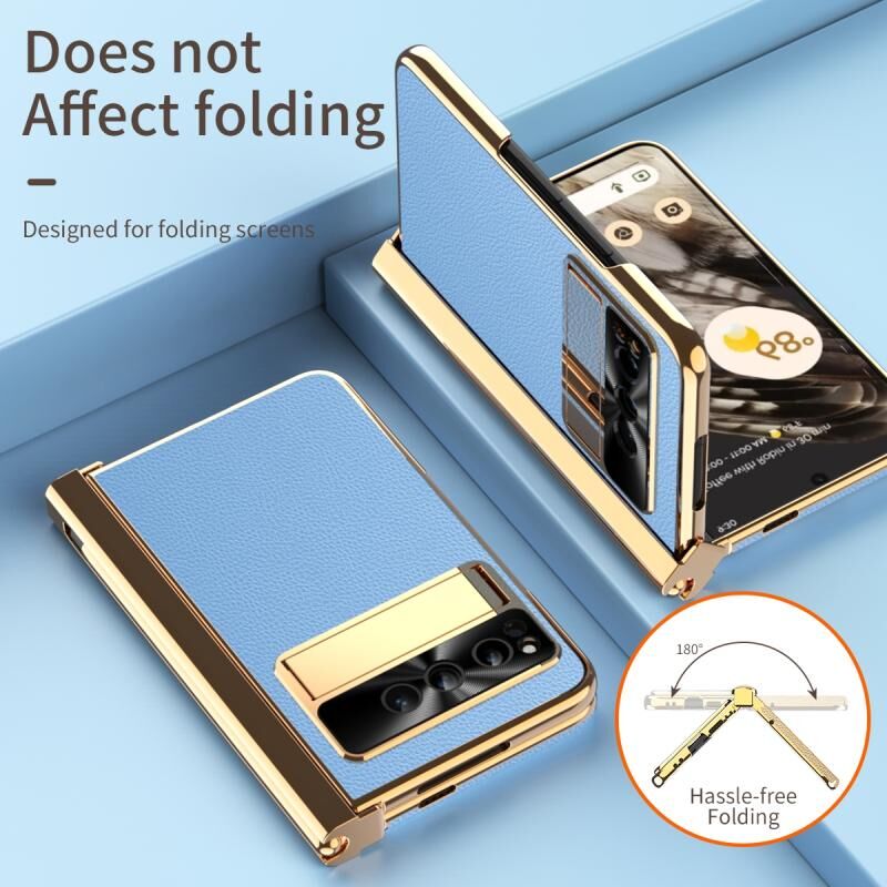 For Google Pixel Fold Litchi Pattern Electroplating Pen Slot Double Hinge Folding Phone Case with Stylus(Blue)