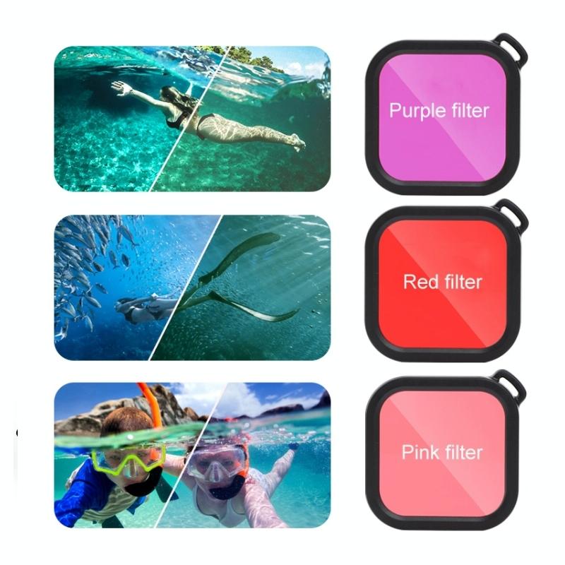 7. With 3 color filters: Purple filter helps color correction in freshwater lakes and reservoirs that appears green. Red filter for professional color correction under blue and tropical water, absorbed red color at depth of 5-25m, prevent taking pictures too blue or too green. Pink is designed to correct light blue or shallow water.