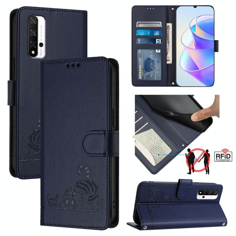 Θήκη τηλεφώνου από δέρμα με ανάγλυφο σχέδιο γάτας και λουρί για Honor 20 4G/20 Pro 4G/20S 4G με προστασία RFID (Μέντας Πράσινο)