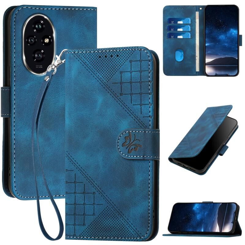 For Honor 200 Global Grid Butterfly Embossed Pattern Leather Phone Case with Lanyard(Dark Blue)