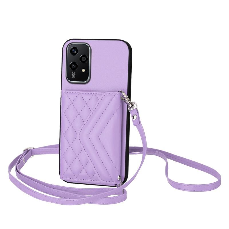 Για Honor 200 Lite 5G Παγκόσμια Rhombic Υφή κάρτα τσάντα RFID υπόθεση τηλεφώνου με μακρύ κορδόνι (Light Purple)