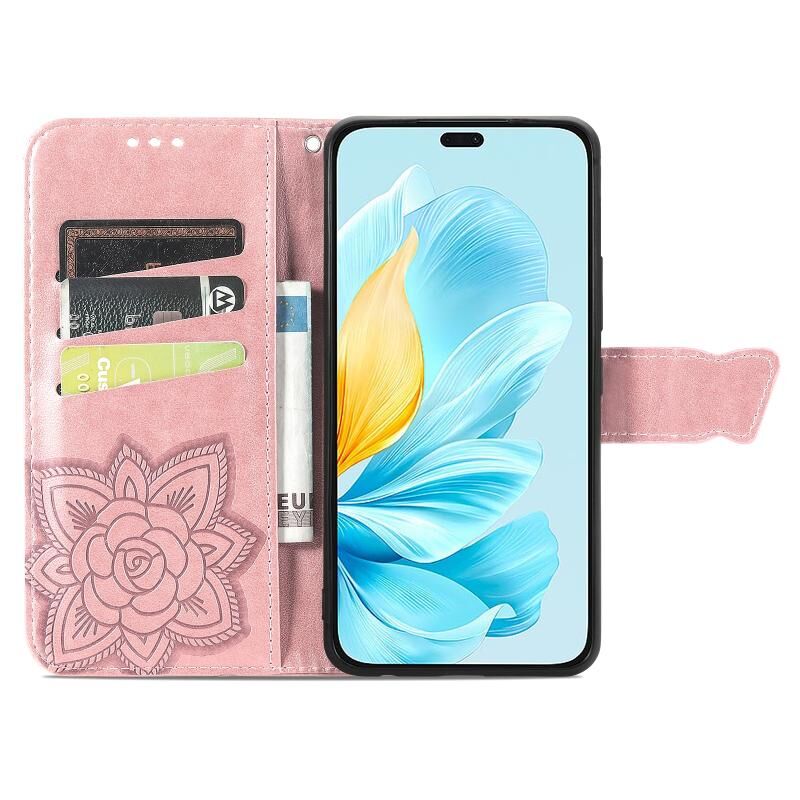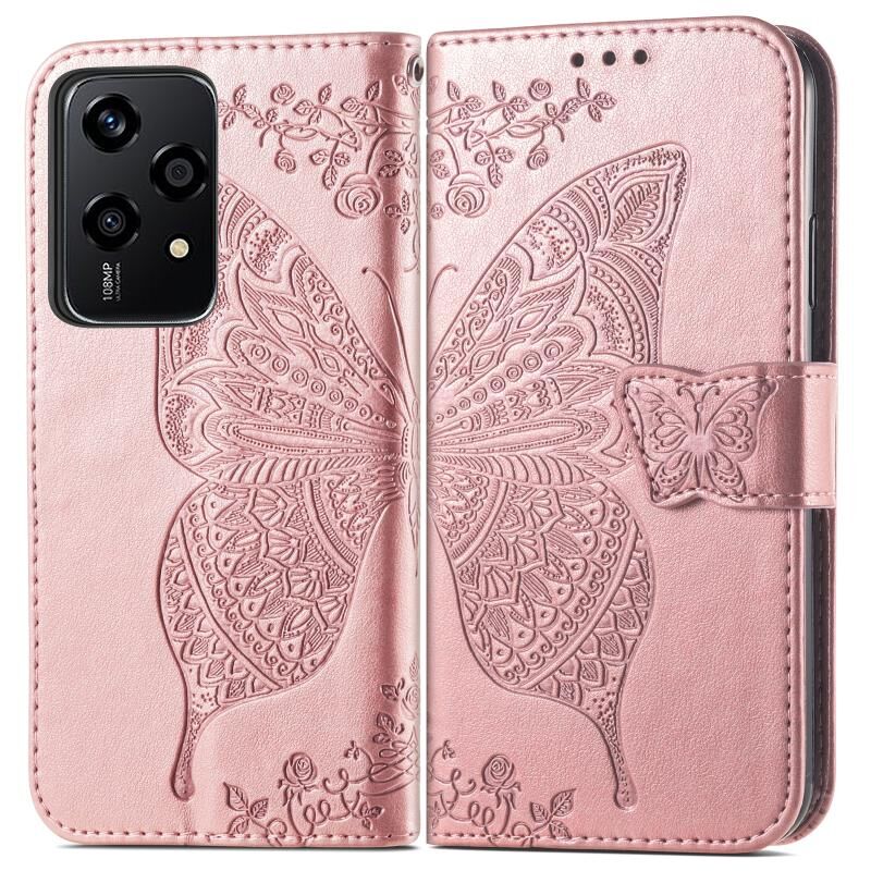Θήκη τηλεφώνου από δέρμα με ανάγλυφο σχέδιο πεταλούδας και λουλουδιών για Honor 200 Lite Global (Χρυσό Ρόδι)