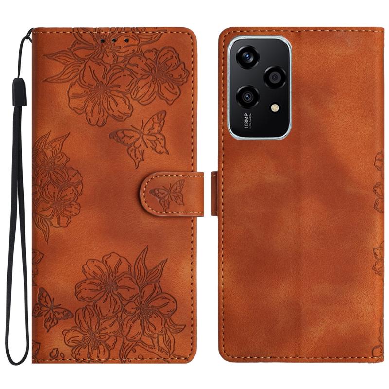 For Honor 200 Lite Global Cherry Blossom Butterfly Skin Feel Embossed PU Phone Case(Brown)