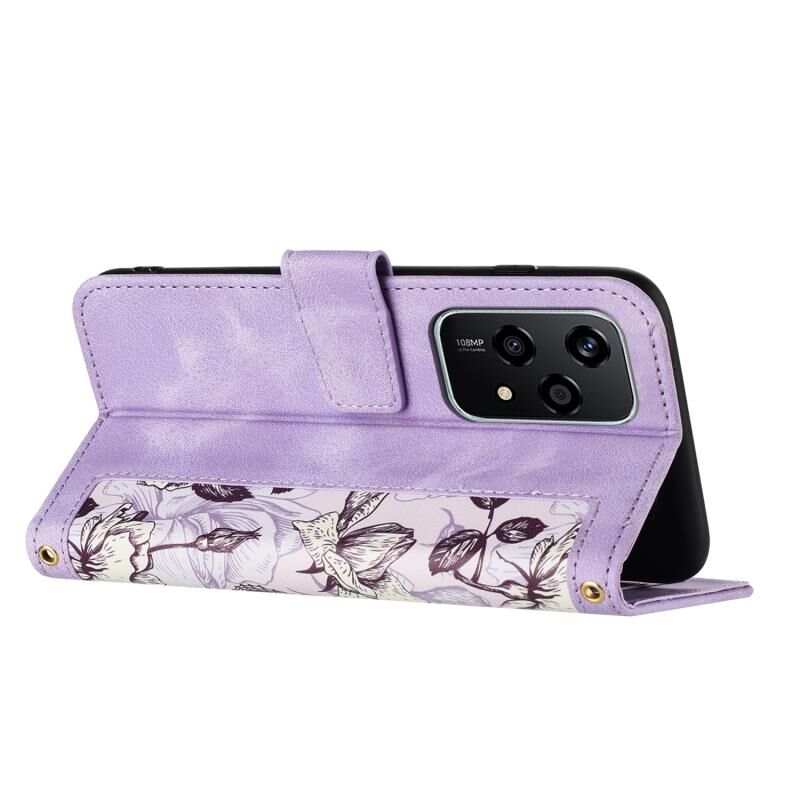 Θήκη τηλεφώνου από δέρμα με λουλουδάτο σχέδιο για Honor 200 Lite Global με κορδόνι (Ανοιχτό Μπλε)