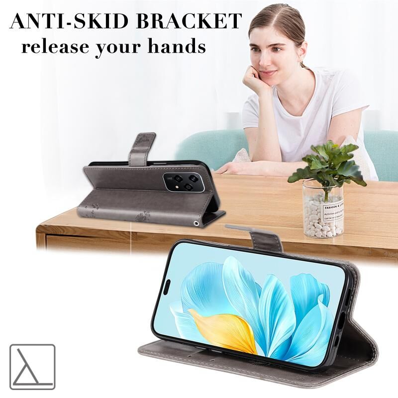 Θήκη τηλεφώνου από δέρμα με σχέδιο ανάγλυφου δέντρου & γάτας για Honor 200 Lite Global (Γκρι)