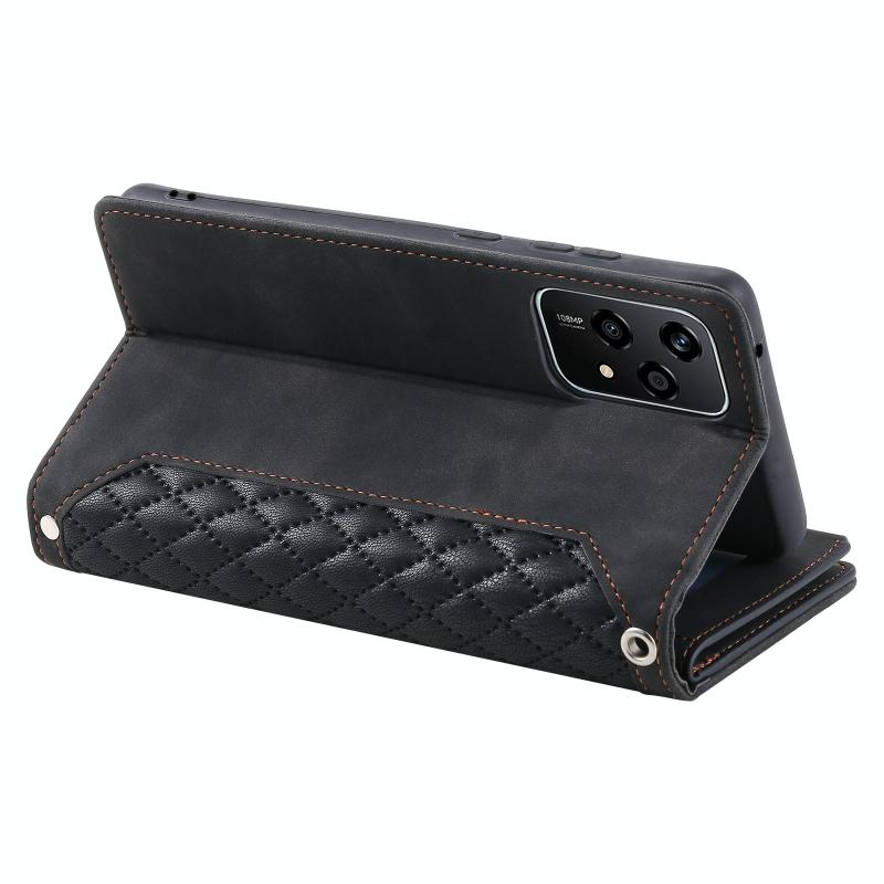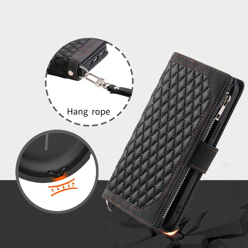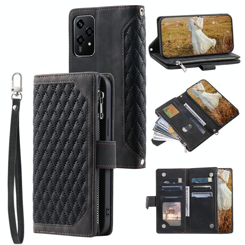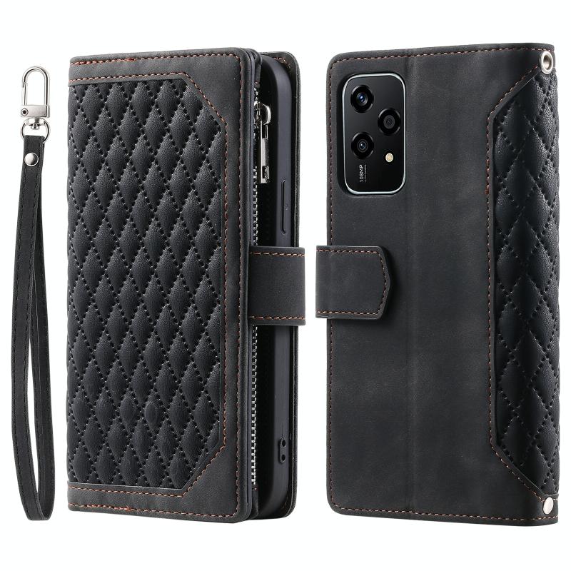 For Honor 200 Lite Grid Texture Zipper Leather Phone Case with Lanyard(Black)