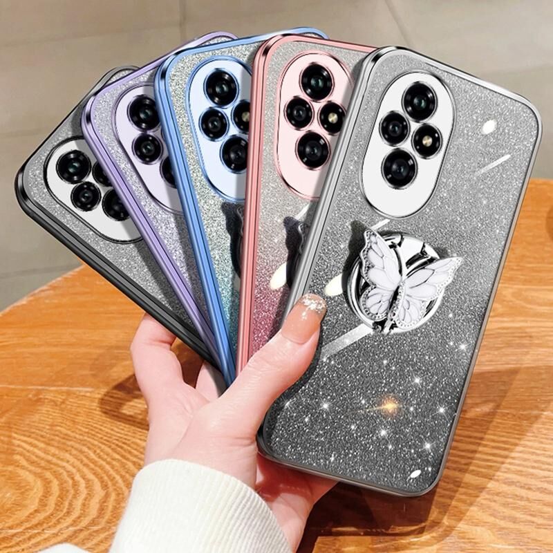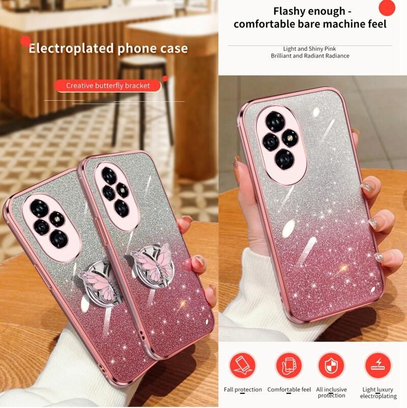 Θήκη κινητού τηλεφώνου TPU με σχέδιο πεταλούδας από γκλίτερ με μεταλλική λάμψη για Honor 200 (ρόζ)