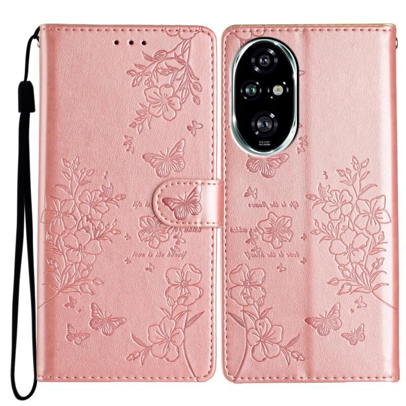 Θήκη τηλεφώνου από δέρμα με πεταλούδες και λουλούδια για Honor 200 Pro (Ροζ χρυσός)