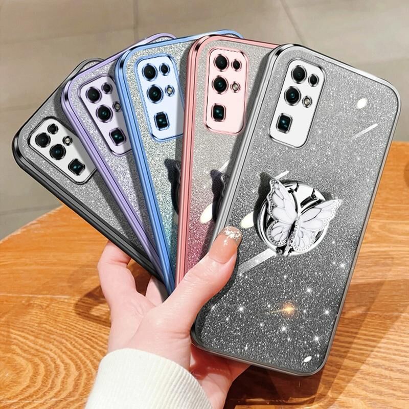 Θήκη κινητού τηλεφώνου TPU με σχέδιο πεταλούδας από γκλίτερ με πλατίνα και διαβάθμιση χρώματος για Honor 30 (Ροζ)