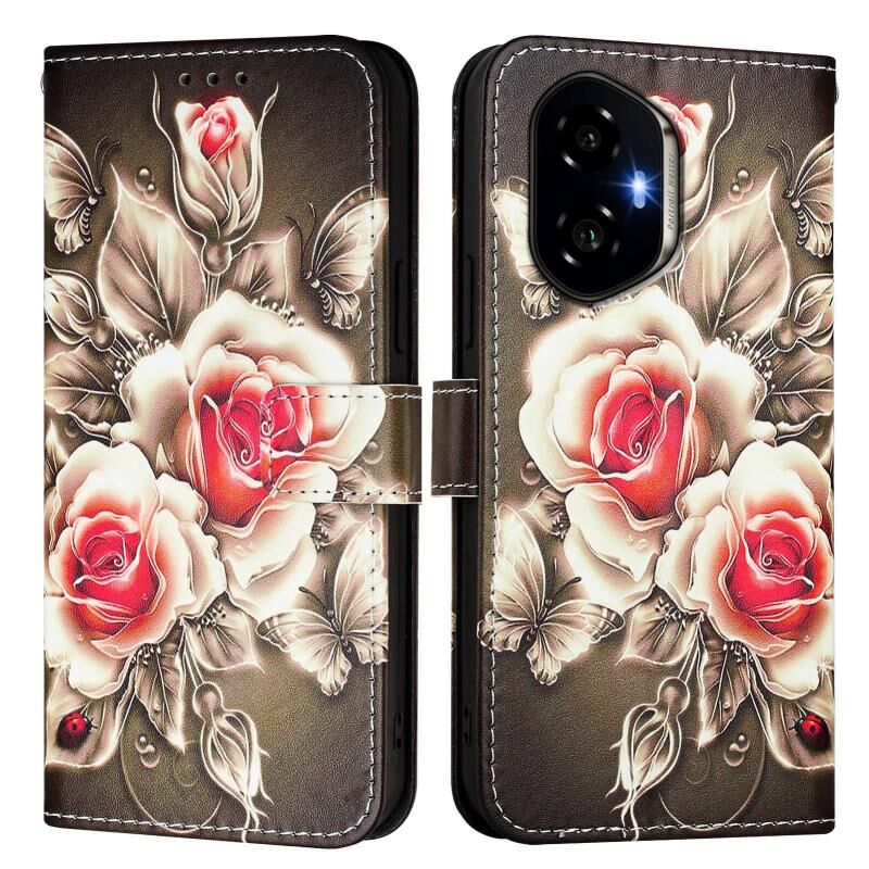 Θήκη τηλεφώνου από δέρμα απλής ύφανσης για Honor 300 με έγχρωμο σχέδιο (Τριαντάφυλλα σε μαύρο φόντο)