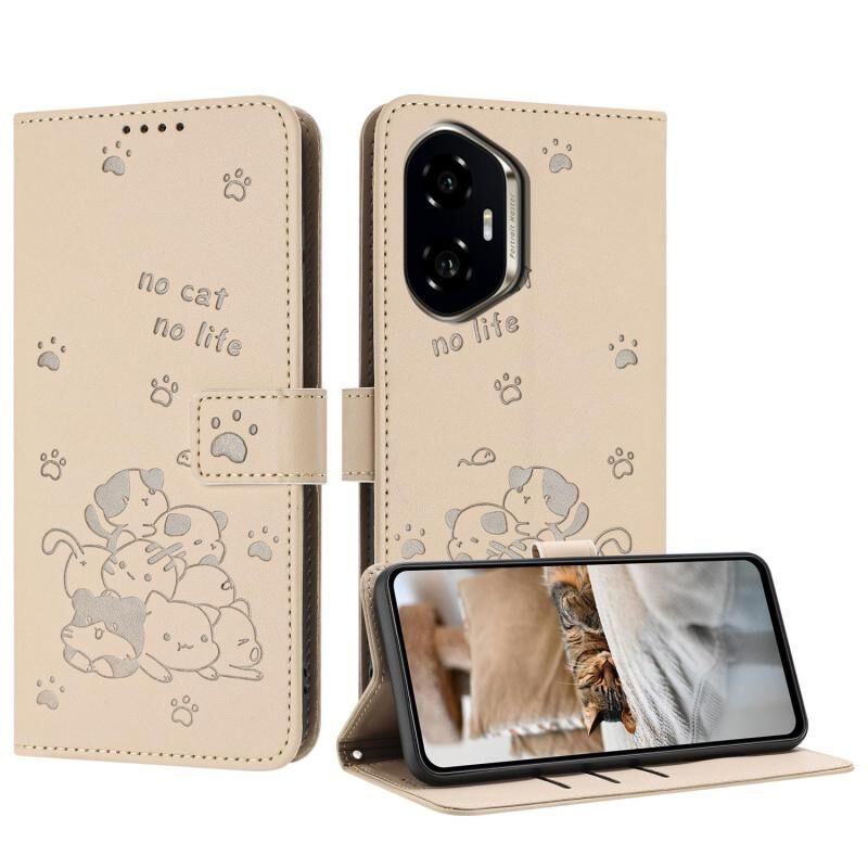 Θήκη τηλεφώνου Honor 300 ανάγλυφο γατάκι από δέρμα με κορδόνι (Μπεζ)