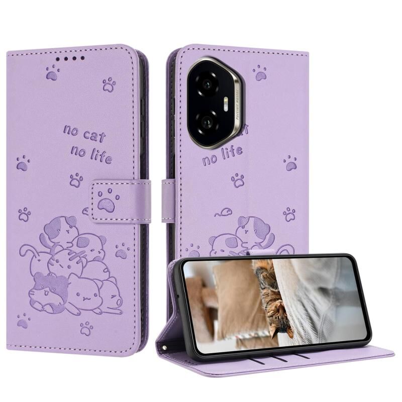 Θήκη τηλεφώνου Honor 300 ανάγλυφο γατάκι από δέρμα με κορδόνι (Μωβ)
