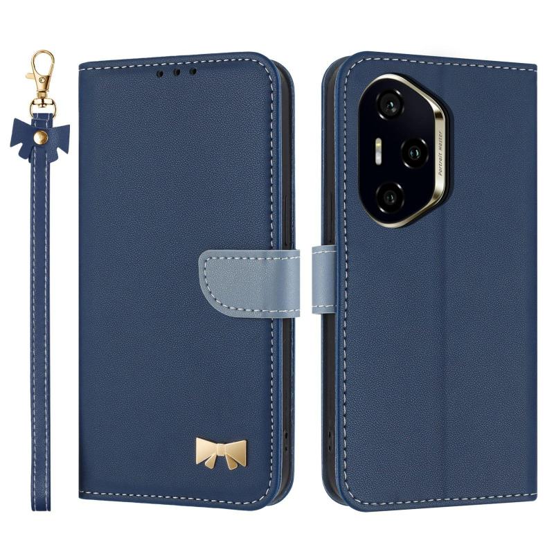 For Honor 300 Pro 5G / 300 Ultra 5G Metal Bow Leather Phone Case with Hand Strap(Dark Blue)