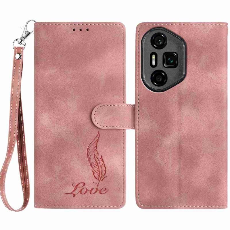 For Honor 300 Skin Feel Embossed Feather Leather Phone Case(Pink)