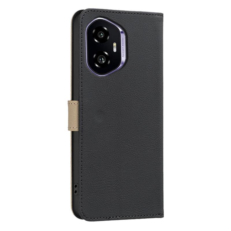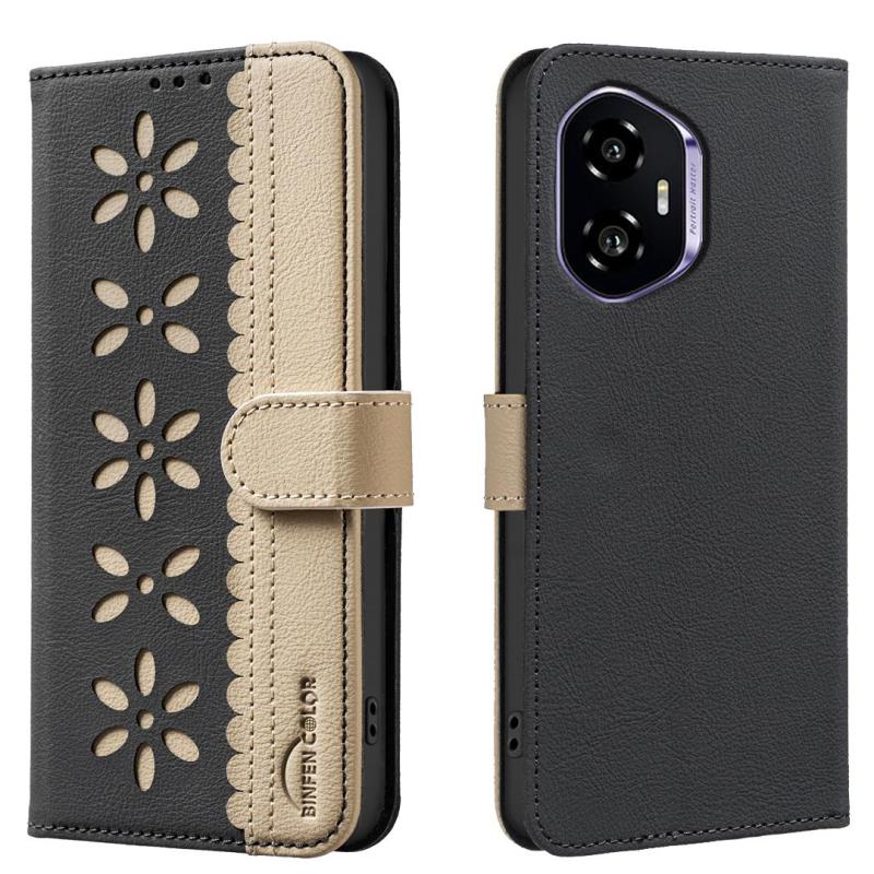 For Honor 300 Splicing Color Hollow Flower Pattern RFID Leather Phone Case(Black)