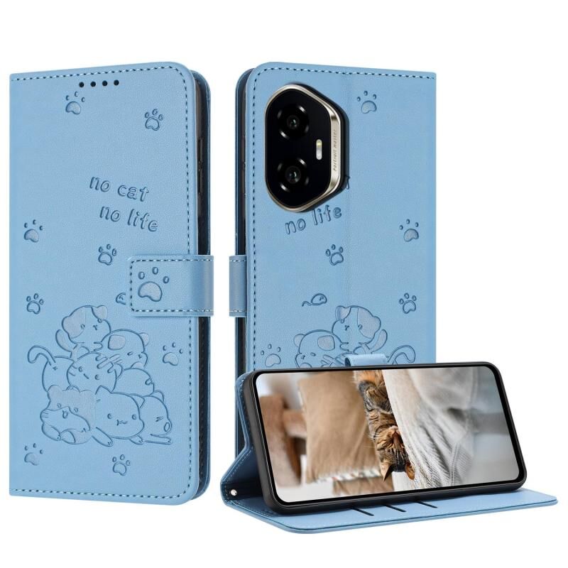 For Honor 400 Global 156.5mm Embossed Kitten Phone Leather Case with Lanyard(Blue)