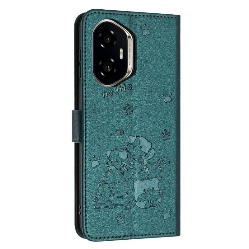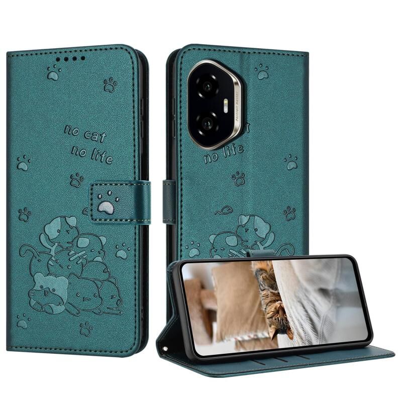 For Honor 400 Global 156.5mm Embossed Kitten Phone Leather Case with Lanyard(Dark Green)