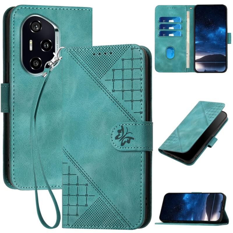 For Honor 400 Global 156.5mm Grid Butterfly Embossed Pattern Leather Phone Case with Lanyard(Light Blue)