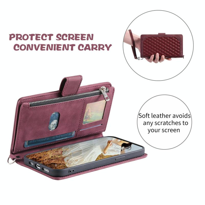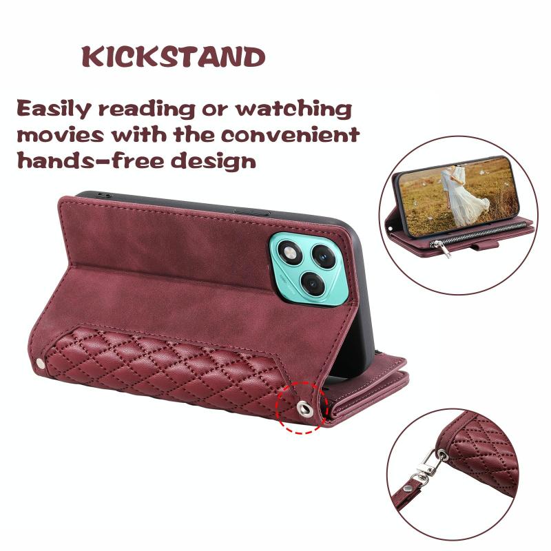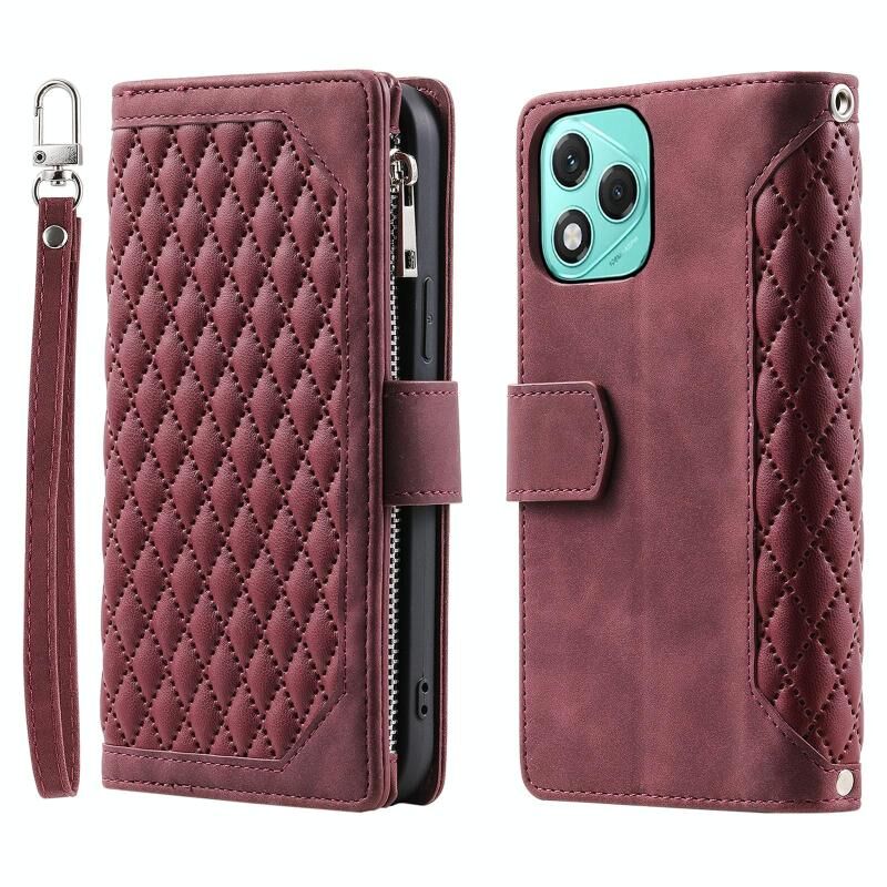 For Honor 400 Lite Global Grid Texture Zipper Leather Phone Case with Lanyard(Wine Red)