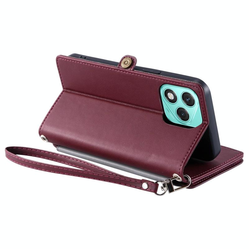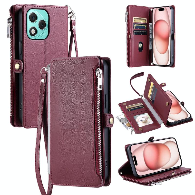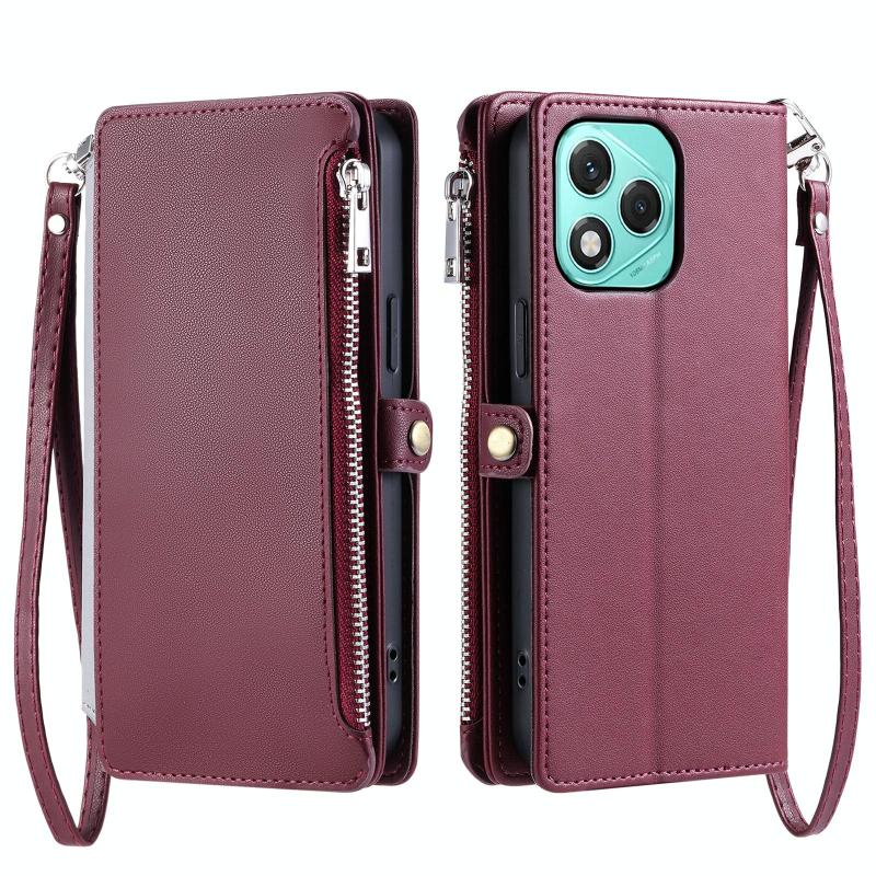 Θήκη τηλεφώνου Honor 400 Lite Global από δέρμα με ραφές, πολλαπλές θήκες για κάρτες και φερμουάρ (Κρασοκόκκινο)
