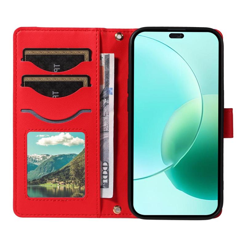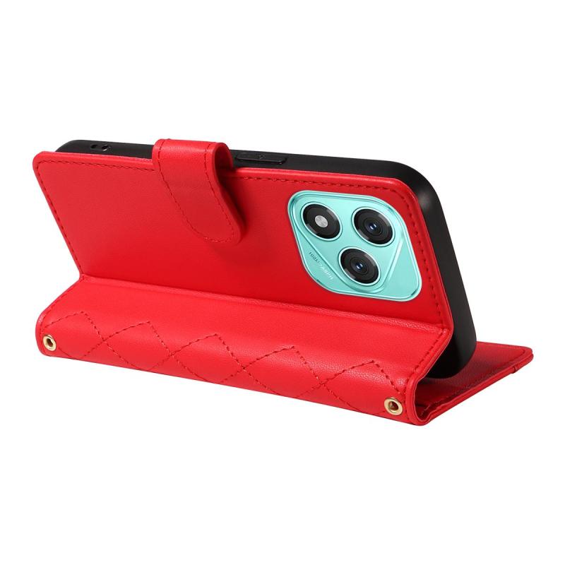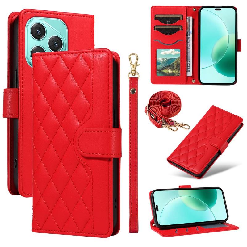 Θήκη τηλεφώνου Honor 400 Lite Global με τρεις υποδοχές καρτών, σχέδιο διαμαντένιου πλέγματος και δέρμα, με μακρύ/σύντομο λουρί (Κόκκινο)