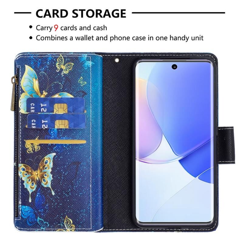Θήκη τηλεφώνου από δέρμα με φερμουάρ και πολύχρωμο σχέδιο για Honor 50 / Huawei nova 9 (Μωβ Πεταλούδα)