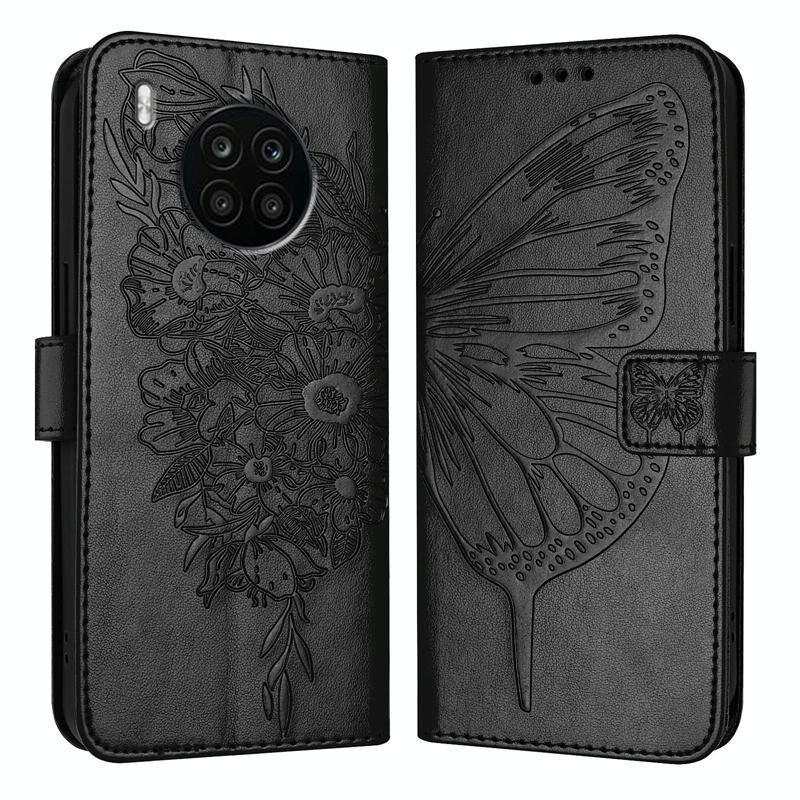 Για Honor 50 Lite / Huawei Nova 8i ανάγλυφη πεταλούδα δερμάτινη θήκη τηλεφώνου (μαύρο)